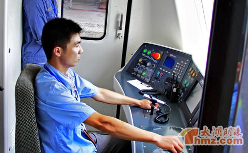 “可以开车,司机明白。”随着秦峰说出出站信号后,车内1个电子屏显示车速最高值45公里。“这是由地面计算机系统实时传来的车速控制值,司机上推‘运行速度设定’手柄,使车速与它保持一致。再启动自动手柄、牵引手柄,列车就慢慢出站了。动车行驶方向由地面系统控制,司机根据信号实时调速等。”